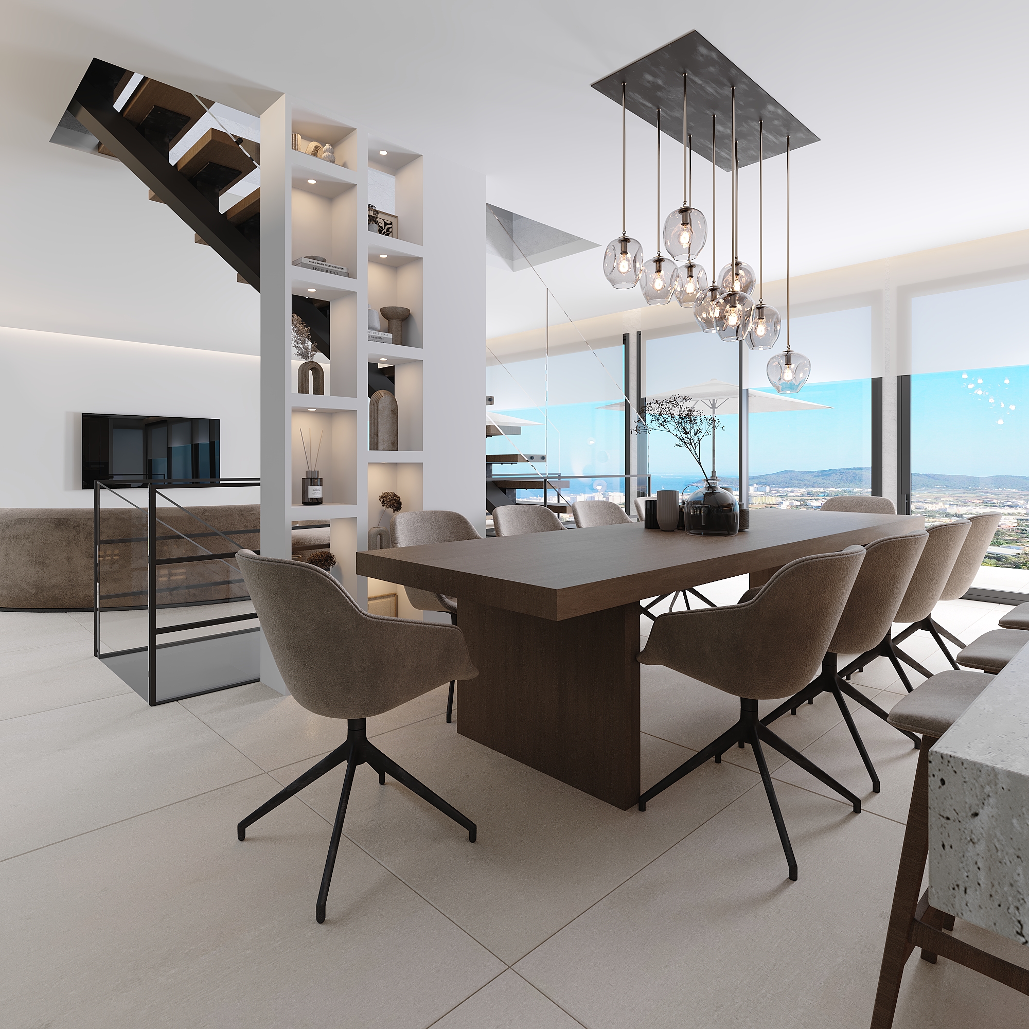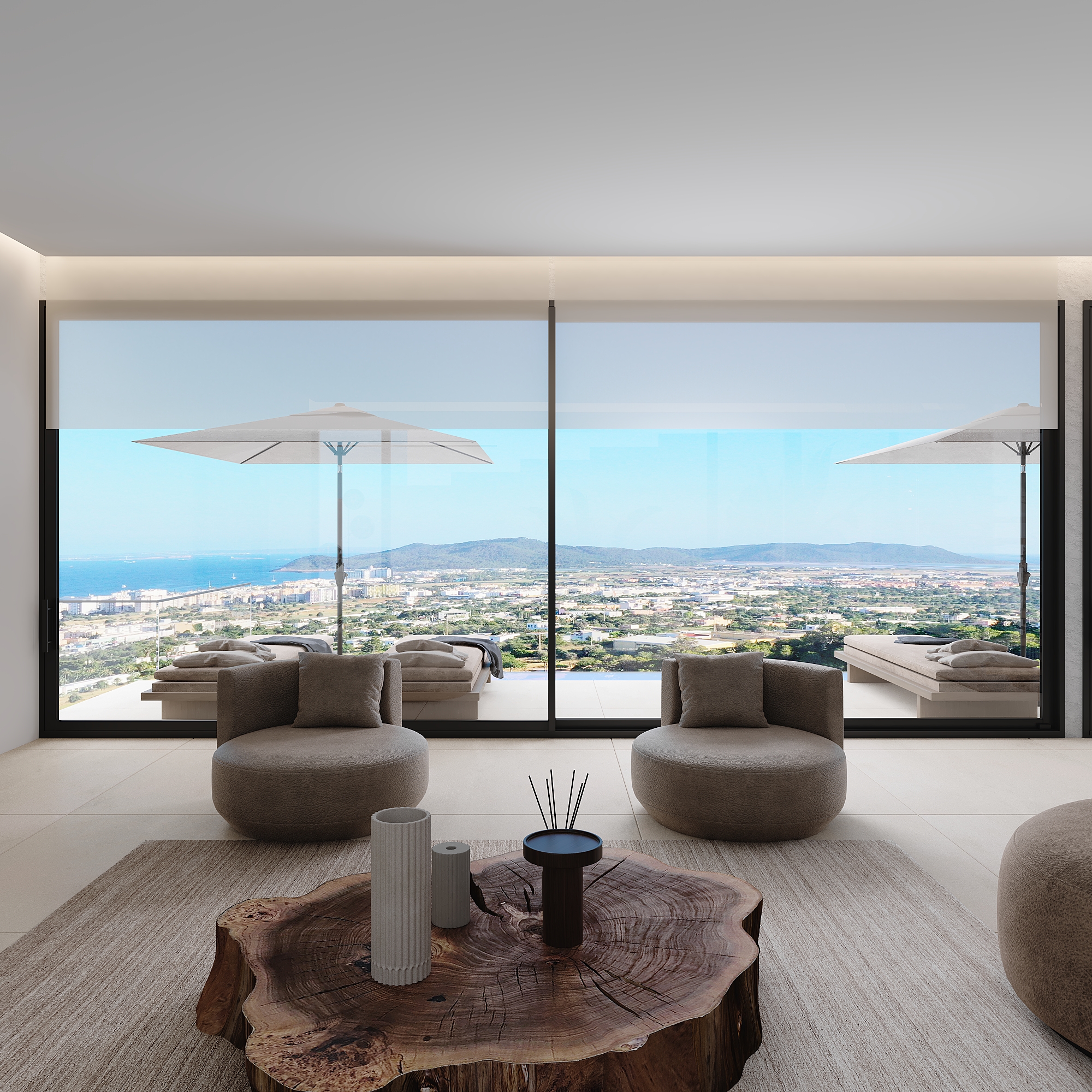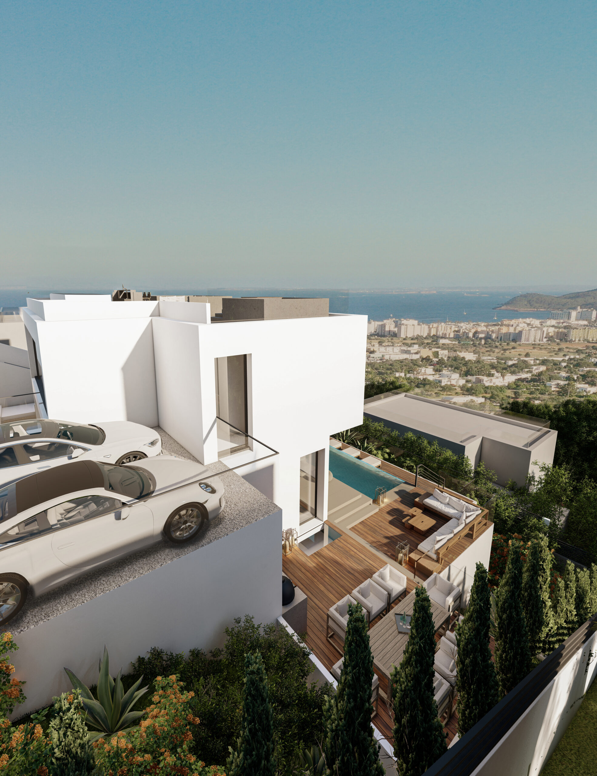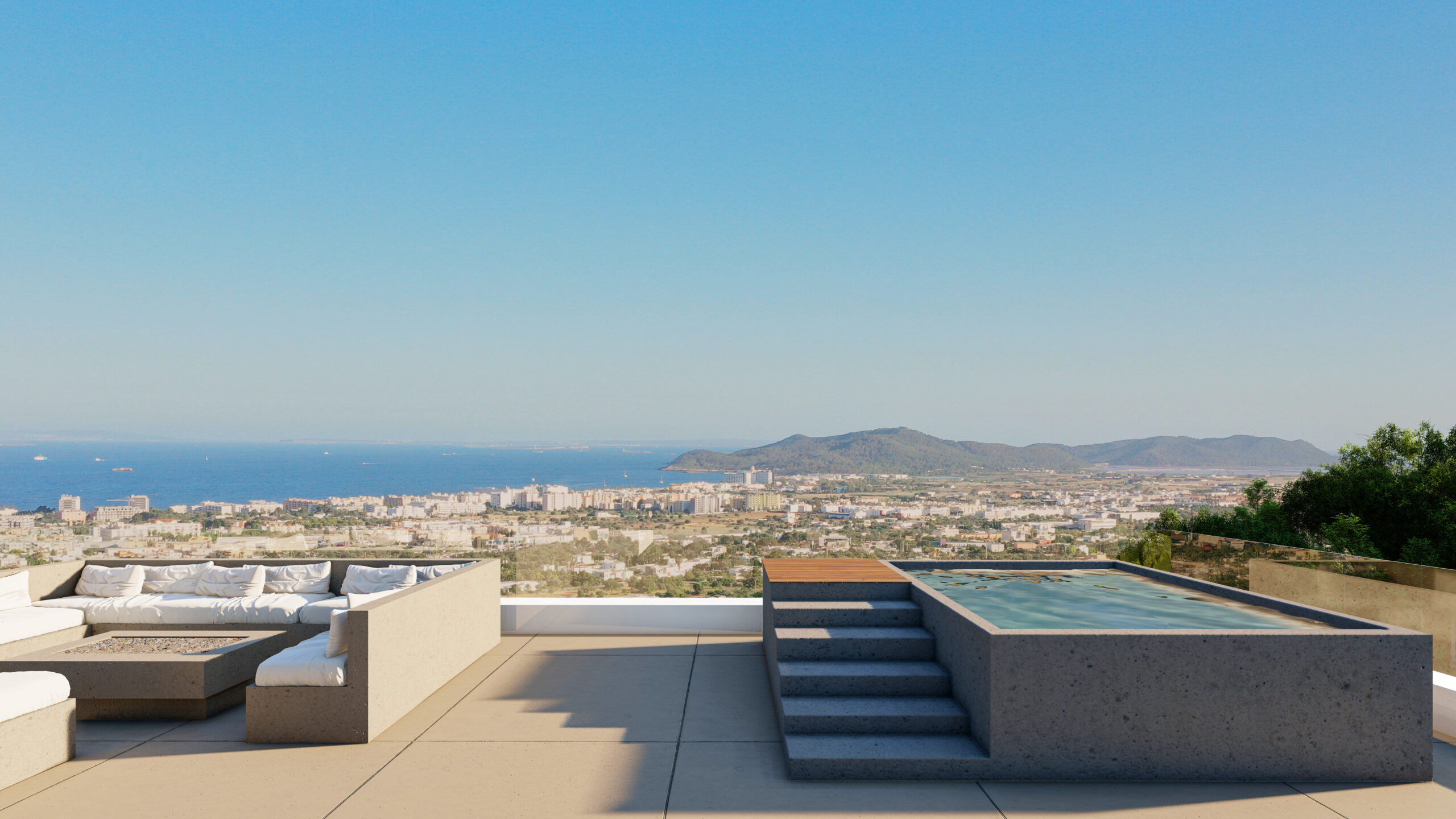 Cas Mut is a stunning villa built on 3 floors with breathtaking views on all levels of the property overlooking Ibiza, Formentera and Dalt Villa. You enter the house on the middle floor, where there is a beautiful open kitchen and living room with views to Ibiza. On this level there is also a bedroom with en-suite bathroom and a guest toilet. Upstairs there are 2 bedrooms, both with en-suite bathrooms, one of which is the stunning master bedroom with separate bathroom and views as seen in the renderings. This unique property has a fantastic roof terrace which is perfect for entertaining or just sitting and admiring the 180 degree views. The construction of Cas Mut presented many challenges due to its particular location on such a steep slope, but Grupo Mimax overcame all these challenges and is on schedule to complete the villa in only 7 months